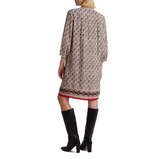 - Contrast tricolor strip at hem